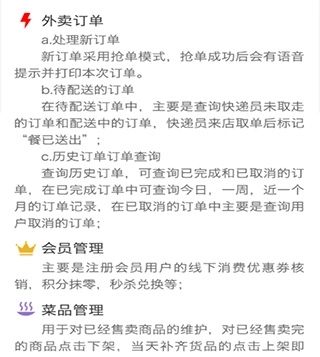 【外卖管理】新订单实时提醒,助力及时抢单;待配送与历史订单均可随时查看。