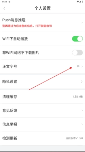 3、接着在【设置】界面内点击【正文字号】;