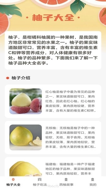 西柚多多百科的应用界面设计得简洁直观,用户只需轻点操作,就能快速获取所需的柚子相关信息。不管是想辨别不同品种的柚子、知晓它们的功效作用,还是学习更优的享用方式,这款应用都能助力你轻松达成目标。而对于那些渴望深入探究柚子文化的用户,这里也准备了丰富的文化背景资料,涵盖柚子的历史传说、文化故事等内容。