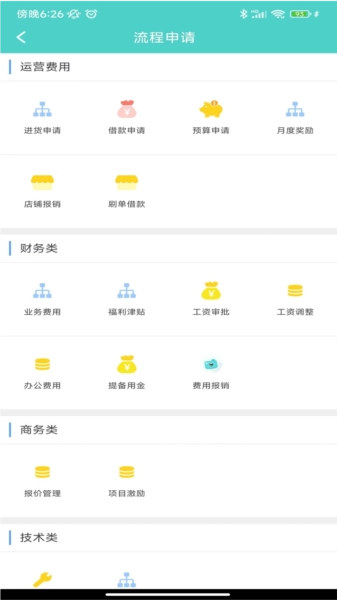提供运营费用、财务类、商务类、技术类等多种流程申请方式,通过简化申请流程,提升审批效率。