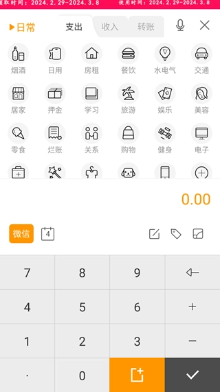 在主页面输入金额,选择收入或支出类别,点击确认按钮就可以完成操作。