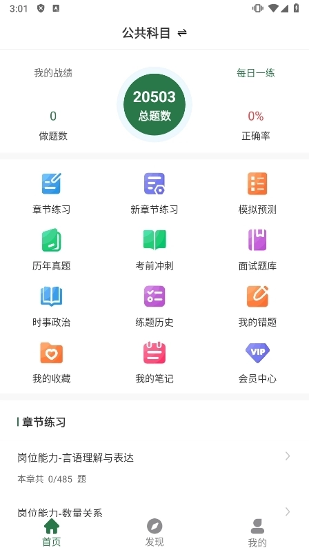 在主界面,用户能够查看各类题库,涵盖模拟试题、历年真题、章节练习等。