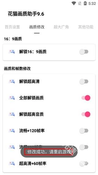 2、点击画质修改选项后,玩家能够使用解锁16:9画质、解锁超高清画质、全部解锁画质、解锁超高音质、流畅+120+60帧率、超高清+60帧率等功能。
