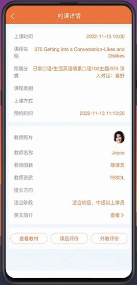 挑选外教:浏览外教的相关资料,了解其教学经历、学员给出的评价以及可预约的时间。