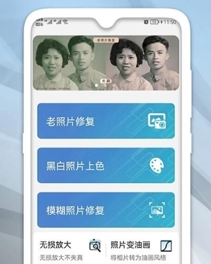 1,AI一键修复破损照片:采用人工智能技术,修复老照片破损褶皱痕迹并高清还原面部。