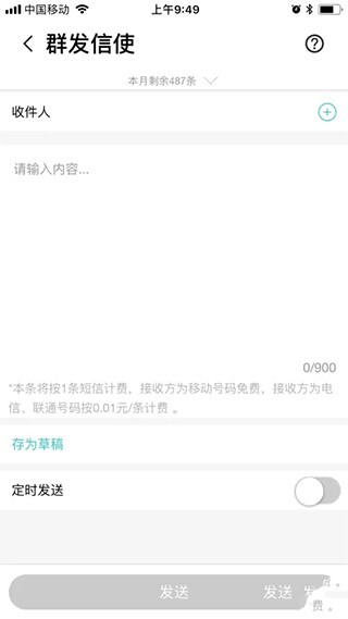 3、进入短信编辑页面,即可进行添加收件人、编辑短信内容、储存草稿以及定时发送等操作。点击“收件人”,会进入和通讯录,在此选择发送人群。点击“定时发送”,能够选择发送时段。