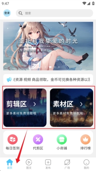 2、进入到首页,可以看到有剪辑去和素材区等内容模块。