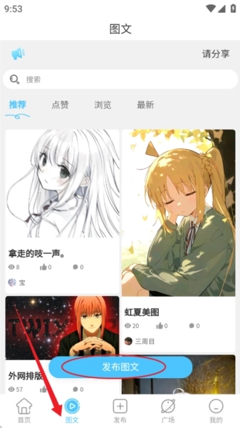 7、而且用户可以自己将自己的作品发布到该平台上进行分享。如图所示,点击发布图文。