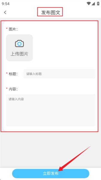 8、如图所示,上传图片,输入标题和内容个,然后点击底部的【立即发布】按钮即可。