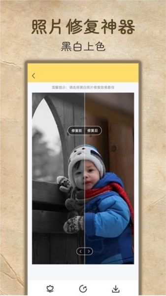 老照片高清修复是一款南京乐萌网络科技有限公司所研发的照片修复软件,为用户带来充满科技的老照片修复功能,让你的照片更加的清晰,对褶皱的老照片进行智能的修复,提高照片的分辨率。利用ai智能修复,直接导入需要修复的图片,无需长时间等待快速帮你修复。还支持黑白图片上色修复,把你的黑白图片快速复原成彩色图片,一键高清复原直接生成大图。在这里所有的用户都可以获得最好的最好的修图效果,各种受损的照片、老照片、模糊照片、低分辨率照片等,都可以在软件中获得最好的修改效果,更好的满足你的手机在线修图需要,老照片高清修复手机版一款可以快速的对各种优质照片好进行快速修复的优质工具,让你可以轻松恢复各种照片画质,软件中还有全新的素描转换、漫画脸等功能,让你可以对各种照片进行美化,没有任何的操作限制,这里还有更多的软件不断探索。