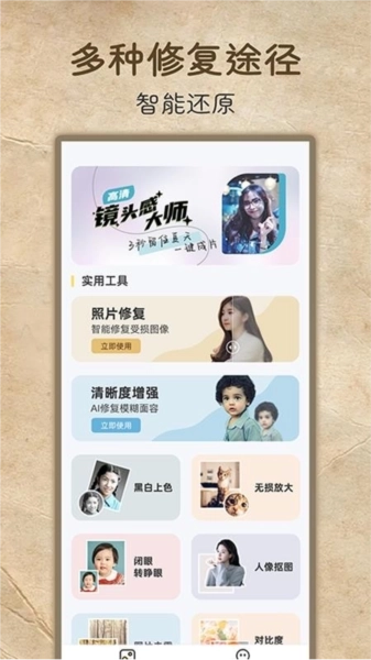 对于有模糊断折的老照片,它可以智能修复。