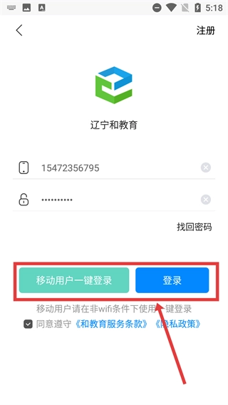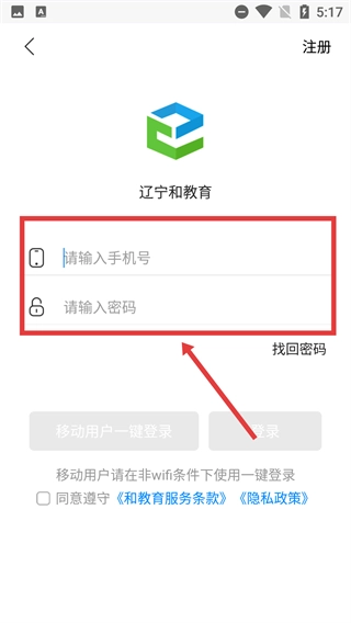 在登录注册页面,填写手机号与密码,勾选同意《和教育服务条款》及《隐私政策》,完成登录前的准备操作。