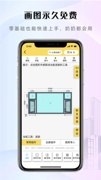 1、免费创作工具:易绘门窗配备了多款可免费使用的绘图工具,能协助用户便捷地完成高质量的门窗设计方案绘制。