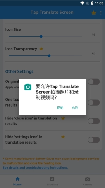 首次打开TapTranslateScreen应用时,需授予麦克风、摄像头及存储权限,这样才能正常使用语音翻译、拍照翻译等功能。