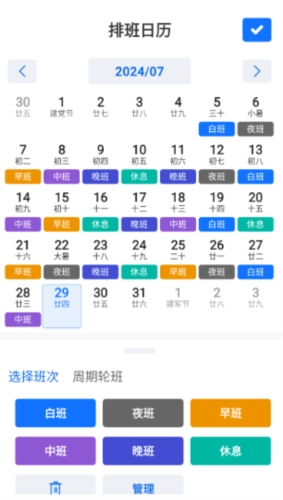 2、操作便捷:设有周期排班与手动排班两种模式,前者适配工作周期固定的人群,后者则满足工作安排不固定的需求。整体操作流程简单易懂,用户只需设置好一个周期内的工作安排,系统便能自动生成专属的工作班表,便于随时查阅个人的倒班表与值班表。