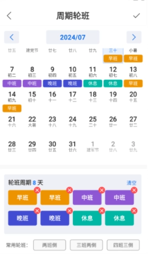 1、自定义排班——用户能够依据自身的实际需求,通过手动设置或者按照一定周期的方式来定制专属的排班计划。