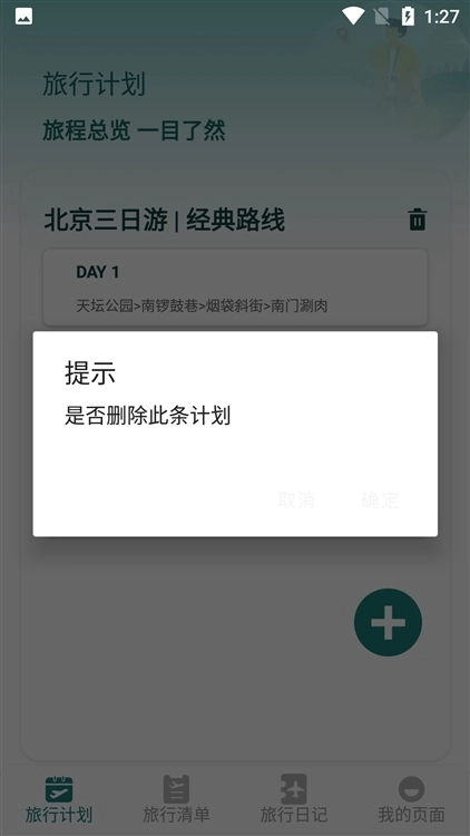 2、长按该行程计划的名称,会弹出操作菜单,从中选择“删除计划”选项后,页面底部将出现确认提示框。