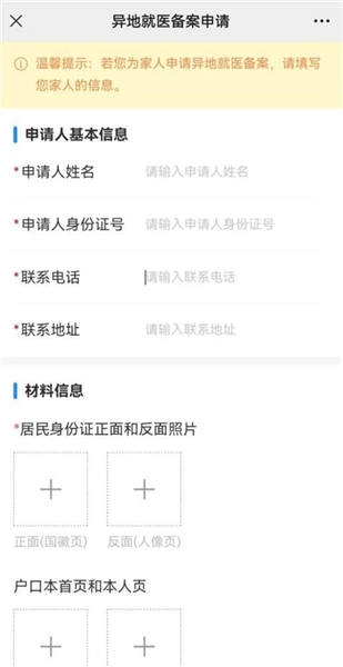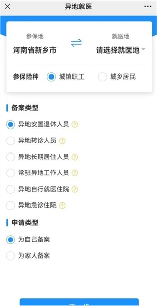 2、选择就医地,并且按照实际需要选择参保险种、备案类型及申请类型选项;按照页面填写对应的信息,并填写对应的备案表,上传备案材料;