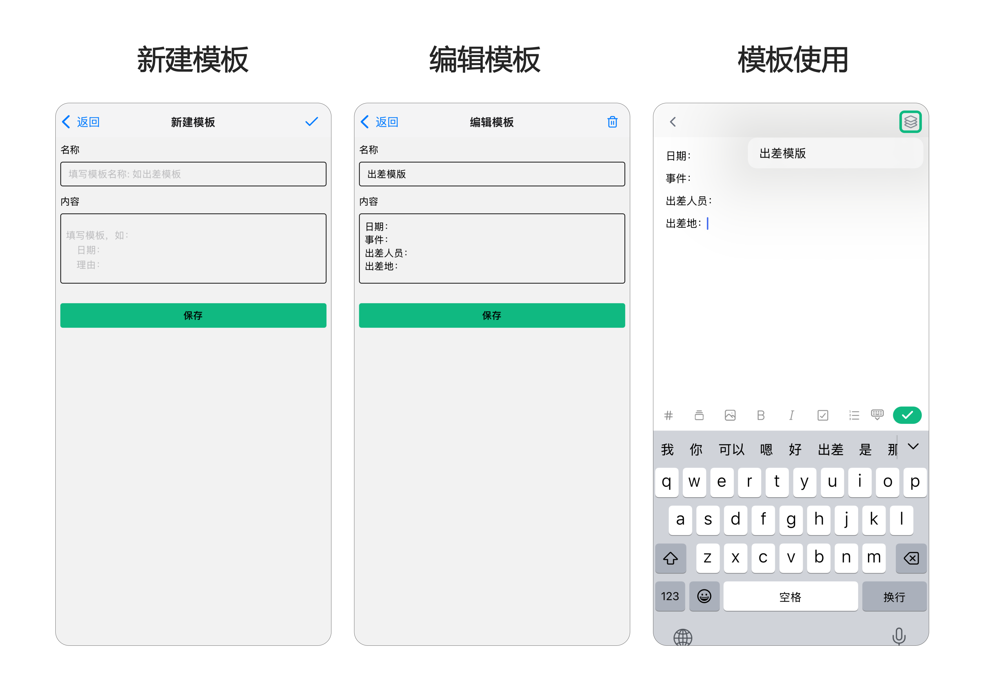 2. 来到模板设置页面,填入模板名称与具体内容,在手动创建笔记时,调用笔记模板,便可快速生成格式一致的笔记。