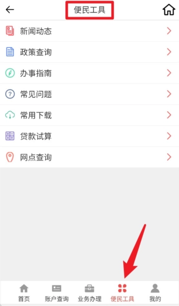 4、“便民工具”板块设有政策查询、办事指南、贷款试算、网点查询等实用信息辅助功能。