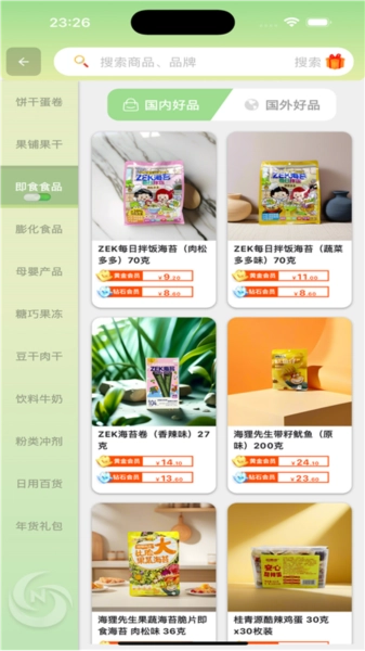 在这款软件里,用户能为婴幼儿挑选合适的食物,助力宝宝吃得更健康;软件还提供日用百货,丰富的商品品类方便用户按需选择,让生活更便捷;各类食品也在平台上供用户挑选,商品展示栏清晰标注了名称和重量,方便用户根据自身需求购买;此外,软件支持礼盒定制服务,用户可依据亲朋好友的喜好定制专属礼盒并赠送,以此拉近彼此距离,增进感情。