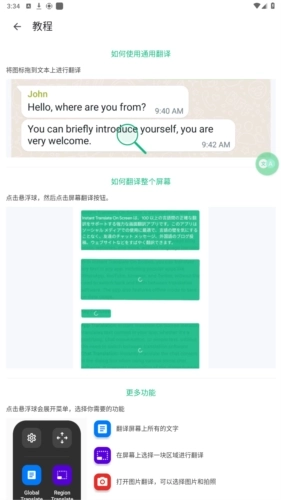 浮动翻译:将浮动球拖动到您要翻译的位置,立即将其翻译成您的语言。点击全屏翻译悬浮球,为您翻译整个屏幕。
