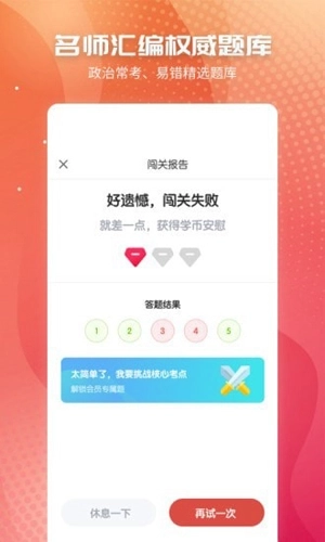 初中政治题型丰富且精炼,汇集各地各校的优质精选题目组成闯关练习,常考知识点与易错点全面覆盖,解析详尽得让人沉浸其中,从初一到初三全程陪伴,让学习充满乐趣与激情。