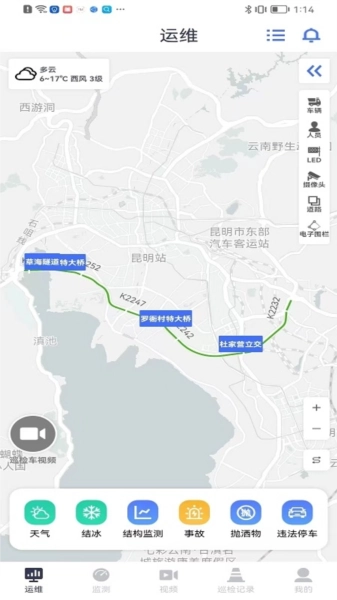实时监控功能:借助地图界面可查看摄像头、气象传感器、交通标识等道路设备的运行状态,同时支持通过缩放、拖动地图来定位具体路段。