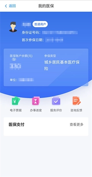 2、接着就顺利进入我的医保查询页面了,这里会展示用户的姓名、身份证号码、首次参保日期、医保账户余额(元)、参保类型以及所在单位。