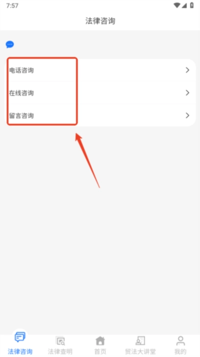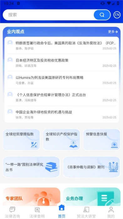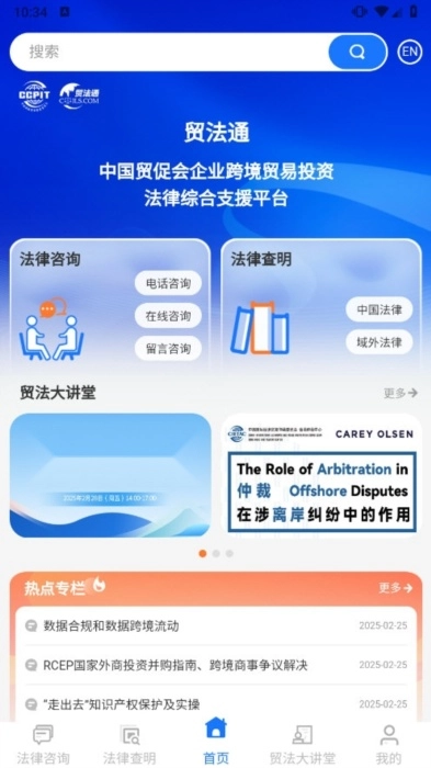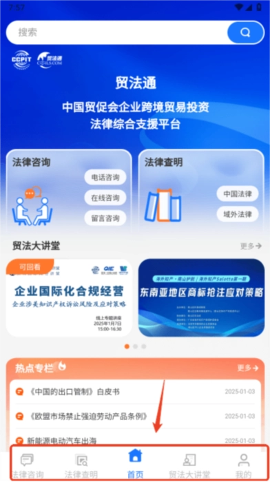 打开首贸法通CTILS平台后,其底部会清晰呈现法律咨询、法律查明、贸法大讲堂、贸促业务办理等核心栏目。
