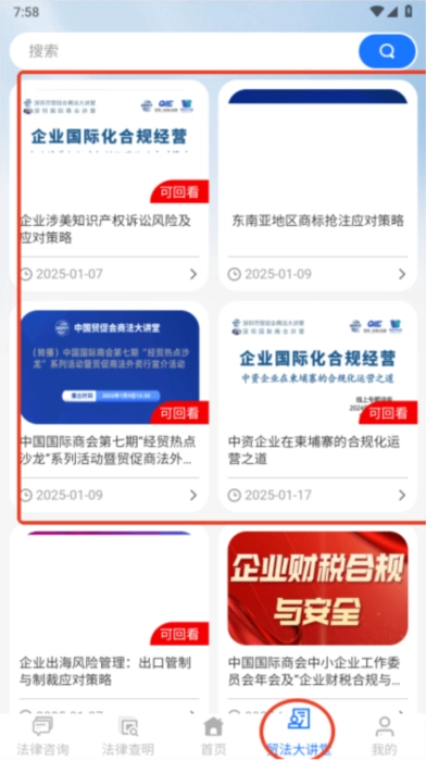 贸法大讲堂栏目,支持查看最新会议与历史会议内容,所有会议均可回看!