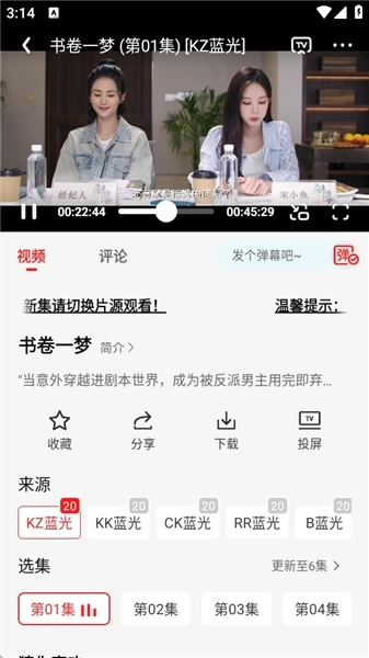 3.在视频播放页面,点击播放窗口唤起菜单列表,找到右上角的“投屏”按钮并点击。
