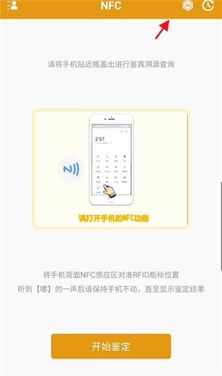 打开后,按照提示将手机背部贴近茅台镇国酒的瓶盖,进行NFC扫描操作。