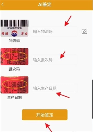 3、进入AI鉴定界面,依次输入物流码、批次码和生产日期,随后点击下方的“开始鉴定”按钮进入鉴定流程。