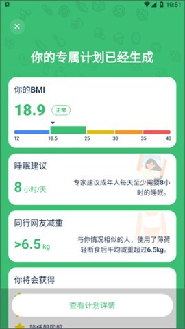 5、可自动测算BMI与体脂率,并为您量身定制最适宜的饮食方案。
