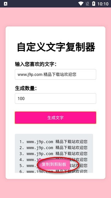 文字复制生成器是一款能帮助用户快速生成大量文本的复制工具,只需把要复制的文本粘贴进去,再设定好所需的复制数量,点击一下就能生成相应的重复文本。它的操作方式简单易用,每位用户都能迅速掌握使用技巧,满足自身的复制需求。