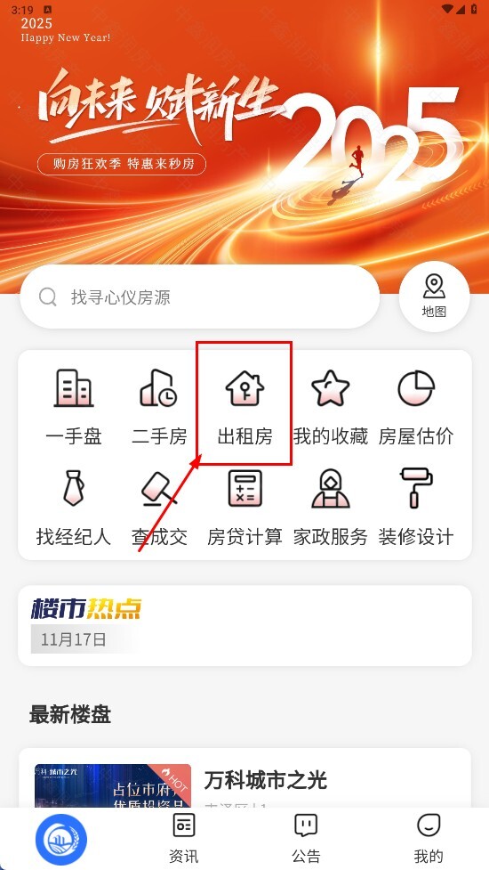 1、点击【出租房-功能按钮】,进入租房页面。