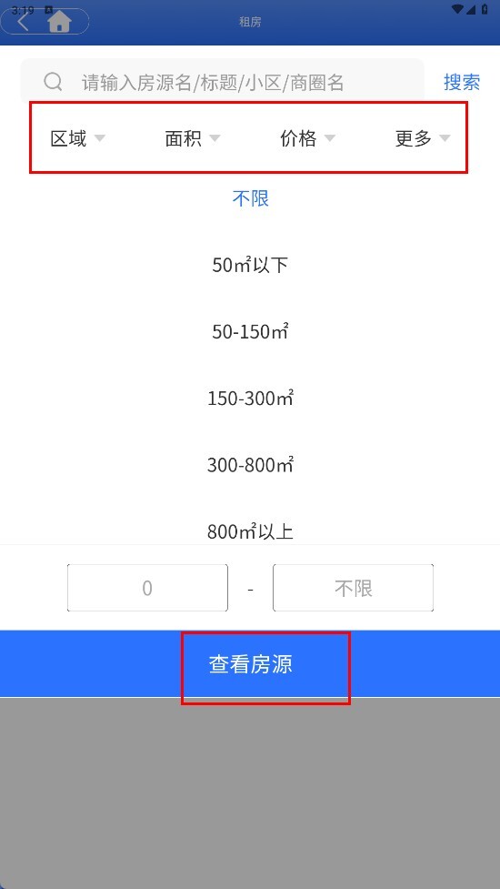 在租房页面,您可以先选择区域、面积、价格等筛选条件,之后点击【查看房源】功能按钮,即可查看满足这些条件的出租房源。