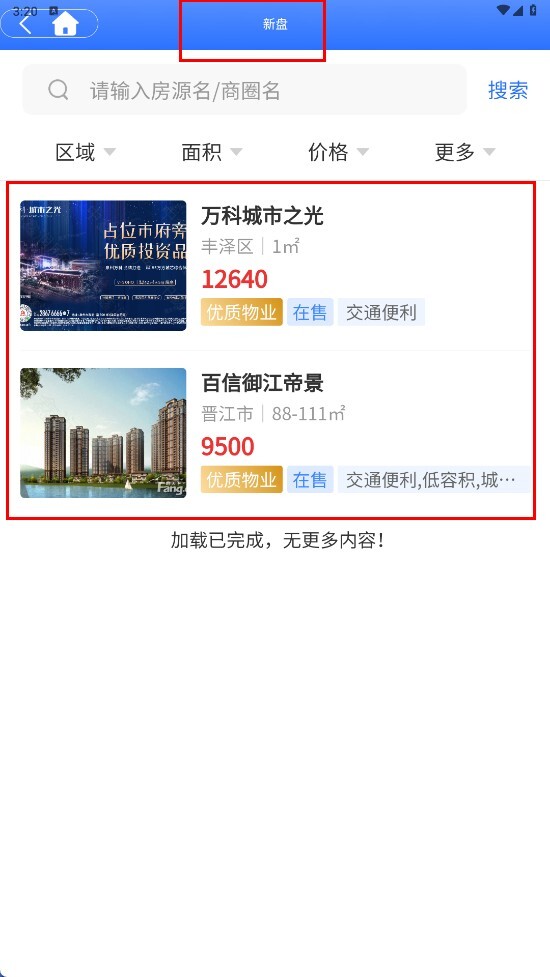 4、点击【新盘-分类标签】,进入新盘页面后,就能查看包括万科城市之光、百信御江帝景在内的各类新盘信息。