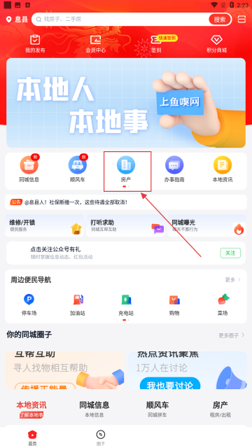 1、在首页点击【房产】功能按钮,进入本地房产服务页面。