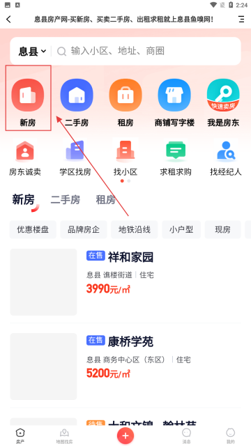 2、进入房产页面后,点击【新房-功能选项】,即可查看当前在售的新房房源列表。