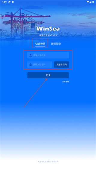 4、完成注册后回到登录页面,选择【快捷登录】选项,输入手机号码和验证码(点击“发送验证码”按钮获取),再点击【登录】按钮即可进入应用。