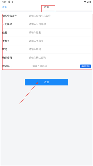 3、进入注册页面后,按顺序填写公司中文名称、公司简称、姓名、手机号码、密码、确认密码,获取并填写验证码,最后点击【注册】按钮,即可完成账号的创建。