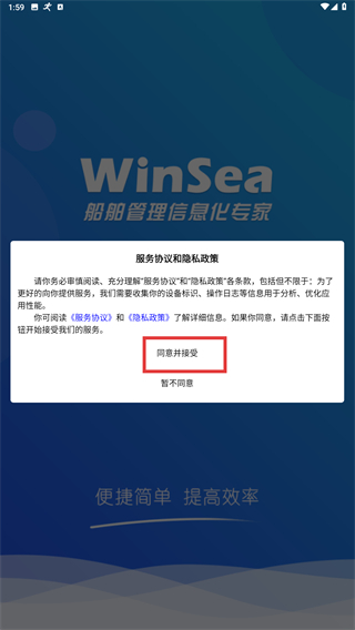 1、打开应用后,仔细阅读服务协议和隐私政策,点击【同意并接受】按钮,以此完成协议确认流程。