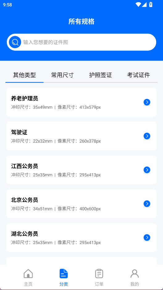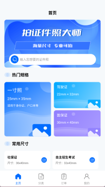 5、虚拟形象换装:丰富的男女童正装模板,用户无需实际更换服装,即可一键切换专业造型,有效增强证件照的形象表现力。1、首页提供多种常用规格和尺寸