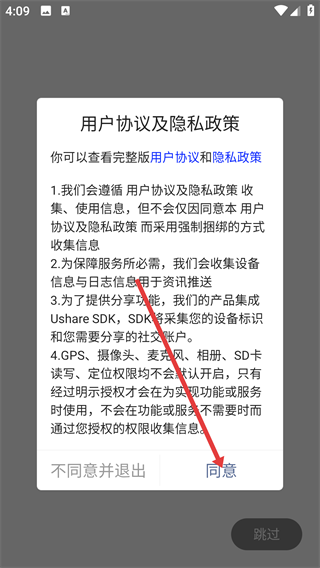 1、当弹出【用户协议及隐私政策】窗口时,阅读相关条款后,点击【同意】按钮即可接受条款并继续使用该应用。