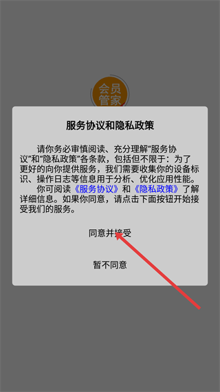 1、当弹出【服务协议和隐私政策】窗口时,请仔细阅读【服务协议】与【隐私政策】的具体条款,之后点击【同意并接受】按钮,即可进入到后续的操作界面。