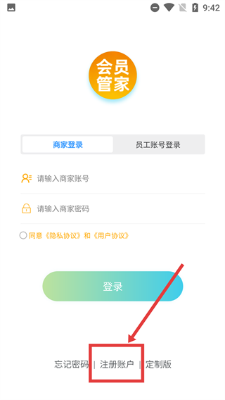 2、在【商家登录】页面,能够选择【商家登录】或者【员工账号登录】,点击页面下方的【注册账户】选项,即可进入注册界面。