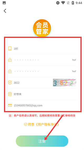 3、在注册页面填写【手机号】【密码】【验证码】等信息,请注意商户名称后续若需修改需经过人工审核,勾选相关协议后点击【注册】按钮即可。