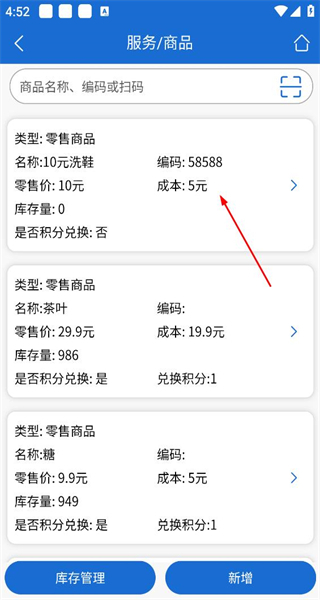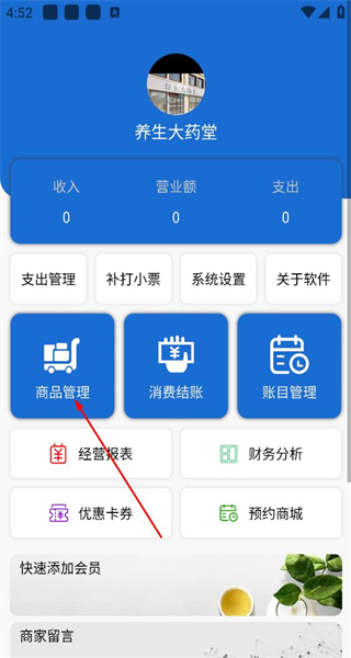 1、启动软件后,首页会呈现收入等数据以及功能按钮,点击商品管理选项,即可进入服务商品页面。